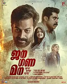 Jana Gana Mana (transl.The Minds of All People) is a 2022 Indian Malayalam-language legal thriller film directed by Dijo Jose Antony and starring Prithviraj Sukumaran, Suraj Venjaramoodu, Pasupathi Raj, G. M. Sundar, Mamta Mohandas, Sri Divya. The music was composed by Jakes Bejoy with cinematography by Sudeep Elamon and editing by Sreejith Sarang. The film released on 28 April 2022[3] to positive reviews for its narrative style, cast performances, and technical aspects.[4]