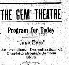 The single reel film, approximately 1,000 feet (300 m) long, was released on May 6, 1910.[11] Publicity for the release of this film was handled by Bert Adler and was successful in generating trade interest and promised a better work then Thanhouser's St. Elmo from the previous month. The high expectations for the film were picked up and included in subsequent articles in The Moving Picture World and The New York Dramatic Mirror in advance of its release. Also, the players in the production were credited for their work, something which was rare and unusual at the time. Edwin Thanhouser would later mark Jane Eyre as the point in which he became confident in the success of the company. The release saw the new company suddenly having more orders than it could fill and the laboratory had to work overtime to produce additional prints to meet the demand.[29] The popularity of the stage production in advertisements makes identifying the showings of the film more difficult than other Thanhouser productions of the time, but theaters across the nation displayed advertisements for the film. Theaters include Indiana,[30] Kansas,[31] Missouri,[32] and North Carolina.[33]