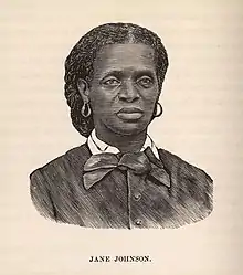 Jane Johnson (c. 1814-1827 – August 2, 1872)[1] was an African-American slave who gained freedom on July 18, 1855, with her two young sons while in Philadelphia with her master and his family. She was aided by William Still and Passmore Williamson, abolitionists of the Pennsylvania Anti-Slavery Society and its Vigilance Committee.
