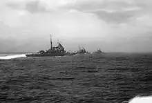 It was discovered after the end of the war that Takao was manned by a skeleton crew and had no ammunition aboard for her 8-inch main armament.[4] Japanese forces surrendered Seletar Naval Base to the British on 21 September 1945. On 27 October 1946, Takao was towed to the Strait of Malacca and was sunk as a target ship by the light cruiser HMS Newfoundland on 29 October 1946 at 03°05′05″N 100°41′00″E / 3.08472°N 100.68333°E.[4] She was removed from the navy list on 3 May 1947.
