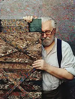 In the early 1990s, Vožniak again sought a path to abstraction, adapting Pollock's method using cast synthetic paint (Homage to Pollock, 1991, 1994, 2003). His works, however, do not appear expressive - they are almost monochromatic or limited to a range of shades of yellow, and the trace of paint created by the casting is close to a regular grid. Vožniak focuses only on the "abstract" energy itself - its traces, records, calligraphy, ritual flow, layered harmony and meditative effect.[12]
