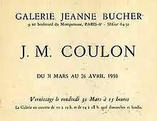 Jean-Michel Coulon (1920–2014) was a French painter from the School of Paris who had the particularity of having kept his work – over 600 paintings – almost secret over his artistic lifetime. Exhibits took place in Paris at the Jeanne Bucher Gallery[1][2] in 1949 and 1950 and in Brussels in 1971.