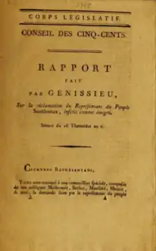After the Thermidorian Reaction of 9 Thermidor II (27 July 1794) Génissieu was charged with examining the conduct of the revolutionary tribunal of Brest. He submitted a cold and impartial report on 16 Prairial III (4 June 1795) describing actions that had often been appalling. His reports on the conduct of the deputies Dupin and Chaudron-Rousseau, justly accused of great misdeeds, were equally dispassionate.[3] In a speech on 11 Floréal III (30 April 1795) Génissieu discussed the dilemma that to make the Committee of Public Safety more efficient by giving it more power would risk a dangerous transfer of authority from the elected convention to the anonymous bureaucracy.[5]