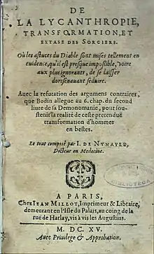Jean de Nynauld was a French physician who wrote an important work on lycanthropy in 1615 titled De la lycanthropie, transformation et extase des sorciers (On lycanthropy, transformation and ecstasy of witches).[1] de Nynauld saw lycanthropy as a form of mental illness rather than a form of magic.[2]