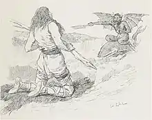 Jean de l'Ours is a beautiful abandoned child raised by a mother bear in Henri Carnoy's version (1885).[22] Along the same vein, Jean de l'Ours was a beautiful foundling adopted by a widow according to Carnoy in another version (1885, illustrated by Édouard Zier),[23] but this, except for an altered telling of the boy's origin, is by and large identical to the tale given earlier by Hippolyte Babou (1862):[lower-alpha 5][24] In both texts he is depicted as an angel-faced, blue-eyed boy who wears a bearskin around his loins, has a lush mane like Samson's falling from head to chest, and carries a poplar sapling as a staff.[25][26]