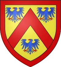 Or, with a chevron gules, accompanied by three eaglets in azure with beaks and talons gules, all bordered by a border gules.
