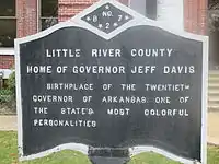 Davis was born near Rocky Comfort in Little River County in southwestern Arkansas. His parents were Lewis W. Davis, a Baptist preacher originally from Kentucky, and his wife Elizabeth Phillips, originally from Tuscaloosa, Alabama.[4] Lewis Davis did not join the Confederate army until drafted in 1864. He named his only son after Jefferson Davis, then-President of the Confederate States of America. His military service was largely performed as a chaplain's commission, but he quit the ministry following the war and became a lawyer.[5]