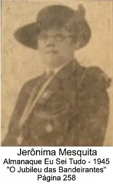 Jerônima Mesquita (30 April 1880  1972) was a Brazilian feminist. She is regarded as the pioneer of the women's movement in Brazil, and co-founded the Federação Brasileira pelo Progresso Feminino with Berta Lutz and Stela Guerra Duval in 1922.[1][2]