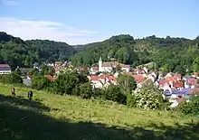The Jewish community at Buttenhausen was established by Baron Phillip Friedrich von Liebenstein by a charter of 7 July 1797.[2] Motivated by the desire to stimulate economic activity in the village, he invited twenty-five Jewish families to settle there under his protection. One of the privileges granted to the new community was the right to establish a cemetery above the new Jewish quarter. By 1870, Buttenhausen's Jewish residents numbered 442 in a total population of 800 and lived in 46 of the village's 100 houses.[3] The oldest legible inscription in the cemetery dates from 1802; the last burials took place in 1943, shortly before the final deportations of Jews from the village. Today, 399 gravestones survive from the period of the cemetery's use.[4]