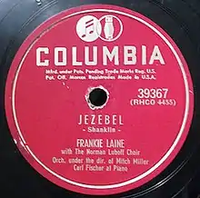 "Jezebel" is a 1951 popular song written by American songwriter Wayne Shanklin. It was recorded by Frankie Laine with the Norman Luboff Choir and Mitch Miller and his orchestra on April 4, 1951 and released by Columbia Records as catalog number 39367. The record reached number 2 on the Billboard chart and was a million seller. The B-side, "Rose, Rose, I Love You", was a hit too and reached number 3.[2]
