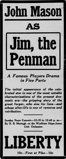 Jim the Penman is a 1915 silent film crime drama produced by the Famous Players Film Company and released through Paramount Pictures. It was the first movie based on a well-known stage play, Jim the Penman by Charles Lawrence Young, about a forger in Victorian Britain. The film was directed by Edwin S. Porter and starred stage actor John B. Mason, in his debut film, in line with Adolph Zukor's efforts to recruit famous stage actors for films. Co-starring with Mason was the young up-and-coming favorite Harold Lockwood. Mason had played the part on the stage in the 1910 season on Broadway.[1]