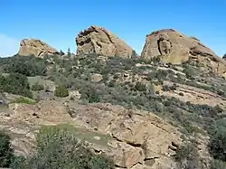 Joaquin Rocks are a group of three pillars of rock, originally known as "Las Tres Piedras" (The Three Rocks), located on Joaquin Ridge, in the Diablo Range, in Fresno County, California. The Joaquin Rocks are at an elevation of 4,121 feet (1,256 meters), and are the most distinguishing feature of Joaquin Ridge. The three pillars of rock are clearly visible on the ridge for many miles from many directions in the San Joaquin Valley and from their summits have a view of much of the valley. It is located, 3 miles (4.8 km) west-northwest of Black Mountain (Anticline Ridge) and 3 miles (4.8 km) southwest of Ragged Valley.[1]