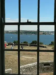 View from the Lodging of the Governor of Pendennis Castle, looking across Carrick Roads towards St Mawes. St Mawes Castle, built by King Henry VIII at the same time as Pendennis, is visible through the right-hand middle pane