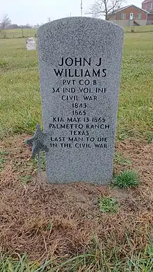 Williams was born in the year 1843 in Jay County, Indiana, and joined the Union Army in September, 1863, probably in Anderson. He moved to Camp Joe Holt where his unit drilled before being put on duty in their field. His regiment spent most of the war on guard and Garrison duty in the Western Theatre, including New Orleans where he was stationed before his unit joined the army forming for the invasion and occupation of Texas in spring of 1865. He first saw action in the Battle of Palmito Ranch near Brownsville, Texas, where he died May 13, 1865. Williams is generally recognized as being the last soldier to have been killed in action during the Civil War,[1] although some sources make this claim for Corporal John W. Skinner, killed on 19 May 1865 in an ambush at Hobdy's Bridge, near Eufaula, Alabama.[2][3]