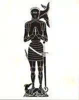 A fragment of his monumental brass survives in Ulcombe Church, now displayed as a mural in the north aisle. The inscription is lost, but is said to have been: Here lyeth John Seintleger Esquyer, and Margerie his wyfe, sole daughter and heir of James Donnett ... 1442.[15] A rubbing showing the date 1442 survives in the collection of the Society of Antiquaries.[16]