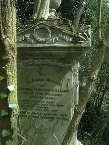 A memorial stone was erected on the island of Rarotonga in 1839 and is still there. Mrs. Williams died in June 1852. She is buried with their son Rev Samuel Tamatoa Williams, who was born in the New Hebrides, at the old Cedar Circle in London's Abney Park Cemetery; the name of her husband and the record of his death were placed on the most prominent side of the stone monument.[6] John Williams' remains (bones) were shipped and are buried in Apia, Samoa. A monument was erected in front of the LMS church of Apia, and the six-storey headquarters of the Congregational Church of Samoa is named after John Williams, commemorating his work in the Samoan islands.