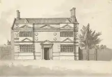 Grimm also records another building just to the north of the palace which he describes as "Colonel Bromhead's House". This fronts onto the High Street. This is an interesting example of the Lincolnshire Artisan Mannerist style of house building of the mid-17th century. It was built of brick for Alderman Original Peart in 1646, and was one of the earliest examples of brick building in Lincoln. It passed from him to the Bromhead family.[7]