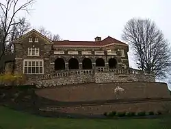 Johnson Camden McKinley House, also known as "Willow Glen," is a historic home located at Wheeling, Ohio County, West Virginia. It was built between 1914 and 1920, and is a 1+1⁄2-story massive dwelling built of ashlar sandstone. It consists of two wings that meet at right angles to form an L-shaped building. The front elevation features a balustraded, one-story loggia that encloses a broad verandah above the piazza. The interior has a two-story entrance rotunda, a grand salon, an English-style library and 30 or so additional chambers. The house was built for coal baron Johnson Camden McKinley and his wife Agra Bennett McKinley.[2]