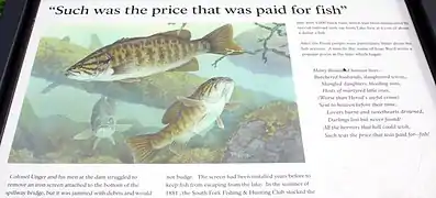 As a result of legislation proposed by U.S. Congressman John P. Saylor, H.R. 931,[27] which was supported by the Blair County Historical Society and the Pennsylvania Historical and Museum Commission,[28] creation of this memorial was approved by the United States Congress on August 31, 1964.[29] Signed into law by U.S. President Lyndon B. Johnson on September 2, 1964,[30] the Johnstown Flood National Memorial was officially established to preserve the remains of the South Fork Dam, which was structurally lacking at the time of its rupture during the Johnstown Flood on May 31, 1889. Also conserved by this legislation were the former Lake Conemaugh bed, along with the farm of Elias Unger and the clubhouse of the South Fork Fishing and Hunting Club, which owned the dam and reservoir.[31][32][33]