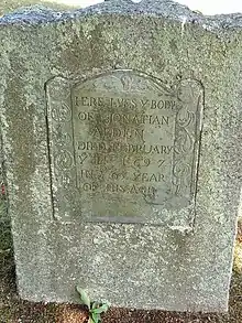 Jonathan Alden died on February 14, 1697, in Duxbury, leaving an estate of £309 (about US$67,500 in 2022).[18][19] He was given a military funeral and "buried under arms." He was interred near his parents in Myles Standish Burial Ground, the oldest maintained cemetery in the United States.[20][21]