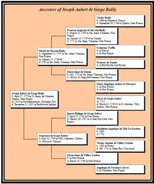 Joseph Bailly was an early fur trader on the Great Lakes. He and his children had significant influence as the region transitioned from English colonialism to frontier expansion of the United States. He was born Honore Gratien Joseph Bailly de Messein on 7 April 1774 in Verchères, Quebec; a village which originated with a land grant to his great-great grandfather Francois Xavier Jarret, Sieur de Vercheres in 1672.[1] It is located 20 mi (32 km) up the Saint Lawrence River from Montreal, on the opposite bank. Bailly was a sixth–generation French-Canadian, descending from Jehan Terriault and Perrine Brault, who were original colonists in Acadia in 1637. Bailly's great-grandfather Nicholas Antoine Coulon, Sieur de Villiers was a trader and Army officer who was killed by Fox Indians on the shore of Green Bay, Wisconsin in 1733. His uncle, Father Charles-Francois Bailly de Messein, spent more than twenty years as a Catholic missionary to the Mi'kmaq Indians of Nova Scotia, and was appointed coadjutor Bishop of Quebec in 1788. Following the family interest in the fur trade, Joseph Bailly received an advanced education in Montreal, and served a clerkship with the North West Company. In 1792, at the age of 18, he finished his education, and entered the fur trade at Michilimackinac. Although from a prominent family, they had little money. His father died in 1795, and Joseph became the main support of his mother, younger brother, and sister for several years.[2]