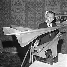 Federal Aviation Agency test pilot Joe Tymczyszyn displays models of Lockheed L-2000, top, and Boeing 2707, bottom, supersonic transport planes - Publication: Los Angeles Times - July 14, 1964.