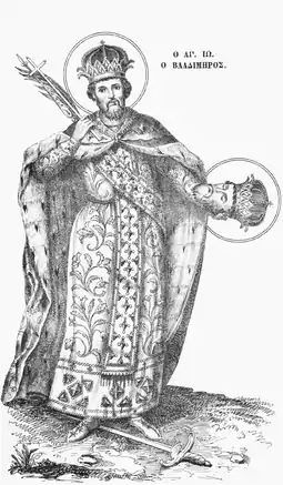 A lithography in the 1858 edition of the Greek akolouthia shows the saint wearing a crown with a double lily wreath, his right foot on a sword. He holds a cross, a sceptre, and an olive branch in his right hand, while his crowned severed head is in his left hand. He wears an ermine cloak and a robe with floral designs, adorned with large gems surrounded by pearls. The Greek text beneath the illustration names the saint as Jovan Vladimir, the pious Emperor of all Albania and Bulgaria, the graceful Wonderworker and Great Martyr, and true Myrrh-gusher.[38][73] In his hagiography included in the Synaxarium of Nicodemus the Hagiorite, the saint is referred to as Emperor of the Serbs (τῶν Σέρβων βασιλεύς). [34]