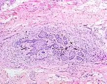 The juxtaoral organ of Chievitz is composed of nests of benign squamoid epithelium closely associated with multiple nerve bundles. The deep location and squamous appearance can histologically mimic invasive squamous cell carcinoma. (Hematoxylin and Eosin stained section, 100x magnification)