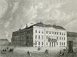 The first Königsstädtisches Theater was built by Carl Theodor Ottmer in Königsstadt, a former settlement neighboring Berlin that is today part of the boroughs of Mitte, Prenzlauer Berg and Friedrichshain, and opened in 1824.[1] Its first director was Karl Friedrich Cerf, who managed it until his death in 1845.[2] An Aktiengesellschaft from its inception, the theater had to rely on financial support by the King of Prussia.[3] When the monarchy stopped its support in 1840, the theater fell on hard times.[3] Involvement in the German revolutions of 1848–49 meant that the theater was closed in 1851 by royal decree.[4]