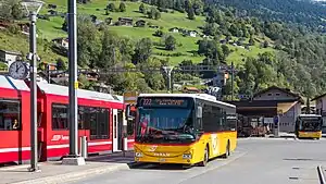 Bus meets train at Küblis station. Well organized public transport even in rural areas of Switzerland.
