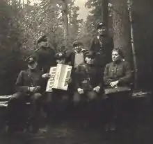 The retreating German front in the Second World War created cells of resistance in Lithuania. Resistance in the Žemaitija region began later than in other areas of Lithuania due to the span of the front. Two notable organisations emerged - the Lithuanian Front and the Lithuanian Liberation Army.[1] The Lithuanian Front was the continuation of the Lithuanian Activist Front. It specialized in unarmed resistance and also if it was necessary, preparation for armed resistance. In 1943 the Lithuanian Front merged with other resistance organizations into the Supreme Committee for the Liberation of Lithuania (VLIK). From 1944 the Lithuanian Front assisted in creating the Lithuanian Territorial Defense Force led by general Povilas Plechavičius.[2] Unlike the Lithuanian Front, the Lithuanian Liberation Army had its own organized armed groups and battle plans, thus making them generally more fit for partisan warfare, along with it being more influential than its counterpart. However, despite this, both organizations cooperated deeply. In July 1944 the leadership of the Lithuanian Liberation Army gave the order to stay in Lithuania and organise resistance. Resistance was still in the process of being organised, and in some cases experienced difficulties. For example in the battle of Virtukai of 15 July 1945, which took three hours, the partisans experienced significant losses.[3] The summer of that year brought hardships to the newly organised resistance movements which forced the partisans to reorganise their structure. Local units such as the Žebenkštis and Lydis units played an important part in the formation. The latter, which was created in 1945, was one of the strongest units,[4] which eventually made up the base of the future military district.[1]