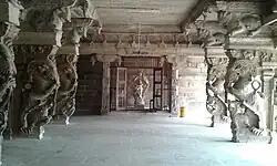 The image of Kailasanathar (Shiva) in the form of Lingam is housed in the sanctum. The shrine of his consort Sivakami (Parvati) is housed in a west-facing shrine.[3] The temple also houses the images of Vinayaka, Subramanya, Veerabhadra, Rishabhandika, and Nataraja on the walls. Two sculptures - Veerabadra and a warrior in the flagstaff hall - are noteworthy. The west-facing shrine adjacent to the flagstaff has a hall with yali pillars, where Nataraja is housed.[1] The temple has sculptural representation of sage Romasa, Agnipathar and Veerabadrar on the pillars in the temple dating back to the Nayak Empire.[4] The shrine of the guardian deity Bhoothanathar, housing his wooden image, is an important shrine in the temple. He is given the primary role during the Chittirai Brahmotsavam festival. It is believed that during historic times, the temple staff used to surrender the keys of the temple to its protector Bhoothanathar.[2] The image of the Nataraja is always covered with Sandal paste and hence called Rathnasabapathy.[4]