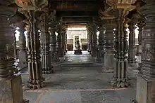A view of the ornate open hall facing the Nandi (bull) in the east in Kalleshvara temple at Bagali
