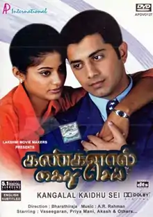 Kangalal Kaidhu Sei (transl. Arrest Me with Your Eyes) is a 2004 Indian Tamil-language musical romantic thriller film written by Sujatha and directed by Bharathiraja. It stars Vaseegaran in the protagonist's role and marks Priyamani's debut in the Tamil cinema. It also marks the only Tamil film performance by the veteran Sri Lankan actor Sanath Gunathilake. The cinematography was done by B. Kannan, while editing was done by K. Pazhanivel. The music was scored by A. R. Rahman, marking his fifth and final collaboration with Bharathiraja. The film revolves around a young, wealthy kleptomaniac's quest to find the love of his dreams in a young woman who is tasked to retrieve a stolen diamond from him.