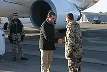 During his tenure as defense minister, Guttenberg made nine visits to Afghanistan and the German soldiers deployed there.[110][111] To gain a first-hand understanding of the situation on the ground and the military risks of the Bundeswehr's mission, Guttenberg went several times to the frontlines of the Afghan conflict.[112][113] He also invited journalists to accompany him on these trips in an effort to educate the wider German public about the nature of the Bundeswehr deployment in Afghanistan.[114] In December 2010, Guttenberg traveled to Afghanistan along with his wife Stephanie to visit with the troops before the Christmas holidays.[115] In addition, he was also accompanied by German TV moderator Johannes B. Kerner,[116] who hosted his prime-time talk show at the Bundeswehr camp in Mazar-i-Sharif featuring the Guttenbergs and German soldiers deployed there.[117] While other German media and the opposition parties sharply criticized Guttenberg for allowing Kerner to host his show in Afghanistan,[118][119][120] the reaction by the German troops and the general public was predominantly positive.[121][122]