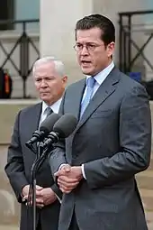 In early 2010, Guttenberg decided to push for fundamental Bundeswehr reforms in an effort to address the structural deficits within the German armed forces[123][124] and to deal with declining defense budgets.[125] The overall goal was to boost the Bundeswehr's expeditionary capabilities[126] while, at the same time, achieving cost reductions. To accomplish these reforms, Guttenberg proposed to reduce the armed forces to 165,000 active duty soldiers and to suspend the draft,[127][128][129] resulting in the most comprehensive restructuring of the Bundeswehr since its founding in 1955.[130] Guttenberg's reform plans were supported by a blue-ribbon "Bundeswehr Structural Commission"[131] that the minister created in April 2010.[132] The proposals triggered a major debate about the country's draft system and were met with significant political opposition, not least in Guttenberg's own political party.[133] In the end, Guttenberg's view won out and on 29 October 2010, the CSU general party convention approved the minister's motion to suspend the draft by a large majority.[134] Several weeks later, Chancellor Merkel's CDU held its own party convention and also voted in favor of suspending the draft.[135] In November 2010, a United States diplomatic cables leak revealed that American diplomats viewed Guttenberg positively, with one cable describing him as a "foreign policy expert, a transatlanticist and a close and well-known friend to the United States".[136]
