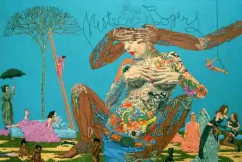 In the 1990s, Kuharic turned to more personal, sometimes macabre, imagery of the body, symbolic objects and female figures occasionally configured in timelines representing sexual partners.[5][1][31] In a 1992 Los Angeles Times review, critic Susan Kandel described one such set of watercolors as a Utopian, "jewel-like vision of a world of women, free not just of men, but of the gaze of men" and charged with energy and empowerment.[5] Later, minutely detailed works depicted women with flayed or heavily tattooed flesh, featured in fraught scenarios or guises and placed alongside iconic figures of femininity (e.g., Priestess, 1996; Backwards Flags, 1998).[32][1] The surreal work, Mister Rogers (1996), was dominated by a central young woman covered with tattoos, who is encircled by a second figure rendered in cutaways of tissue, bones and entrails and surrounded by small female figures: a debutante, a dominatrix, nuns and Eastern religious devotees, and a trapeze artist among them; another painting depicted a bare-breasted woman decked in pearls with red and blue worms teeming from the sockets of her skull.[25][28][32]