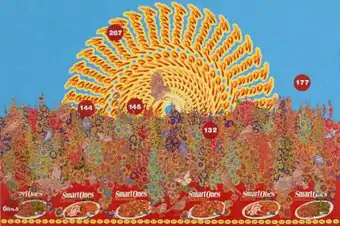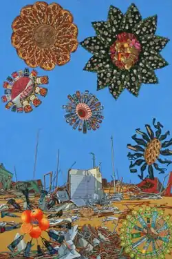 In the 2000s, Kuharic shifted toward more socio-politically focused work using found (or what she termed "unsolicited") imagery appropriated from local newspapers and magazines, slick-printed flyers, and junk mail.[22][8][4] She reconfigured the imagery into packed paintings examining American overabundance, consumerism, and boom-and-bust real estate and financial markets, taking a tone that was simultaneously critical, celebratory and surreal.[3][33][12][6] For example, Super Bowl Sunday (2003) consisted of seven mandala- or flower-forms composed of sparkling, fanned-out products (Gatorade and beer bottles, shoes, cans of produce, meat) that hovered like spacecraft in a blue sky over a devastated, rubble-strewn landscape depicting a bombed out, tiled bathroom and tangle of twisted pipes.[12][6] It drew on Kuharic's memories of the chaos of leaving her downtown New York studio following 9/11 and relocating to St. Louis.[12] Village Voice critic Kim Levin described that work and others in Kuharic's show "Throb" (P.P.O.W., 2004) as "zonked heartland imagery of burgers, fries, flags, Super Bowl stuff, and corn as high as an elephant’s eye" relating to "our country’s current bad trip."[2]