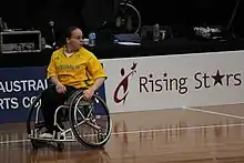Hill made her national team debut in 2005 in Malaysia at the World Junior Wheelchair Basketball Championships.[5] She played for the Australia women's national wheelchair basketball team, universally known as the Gliders,[15] at the IWBF World Wheelchair Basketball Championship in Amsterdam in the Netherlands in 2006,[9] where the Gliders came fourth,[16] at the 2007 Asia Oceania Qualification tournament, and at the 2007 and 2009 Osaka Cup in Japan.[9] She subsequently represented Australia at the 2010 World Championships in Birmingham, where the Gliders again finished fourth,[16][3] and was a member of the 2010 team that played in the Osaka Cup.[17] By August 2012, she had played 110 international games.[18]