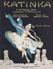 Katinka was first performed at the Park Theatre in Morristown, New Jersey on December 2, 1915 and subsequently moved to the 44th Street Theatre for its Broadway premiere on December 23, 1915.[2] The production starring May Naudain and Sam Ash as Katinka and Ivan was conducted by John McGhie and directed by Frank Smithson, with set design by Edward Sundquist and costume design by Paul Arlington. The show was an immediate success and ran on Broadway for 220 performances. It also had personal consequences for Friml, who began an affair with one of the chorus singers, Blanche Betters. The couple married in 1917 and divorced acrimoniously two years later, a fact which caused a New York judge to deny his 1921 request to become a naturalized US citizen.[3] Following its Broadway run, Katinka toured to several American cities including Los Angeles, Boston, Baltimore, St. Louis, and Atlanta and had regular revivals in the US until the late 1940s, as well as radio broadcasts. One of its rare 21st century revivals was in November 2009, when it was performed in concert version by the Comic Opera Guild of Ann Arbor, Michigan.[4]