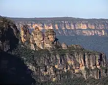Katoomba's main industry is tourism based on its mountain scenery.[17] The rock formation known as the Three Sisters, viewable from Echo Point about 2 kilometres (1.2 mi) south of the main town, attracts thousands of visitors each year.[18] Other features of the Jamison Valley visible from Echo Point include Mount Solitary and the rock formation known as the Ruined Castle. A short walk from Echo Point leads to the Giant Stairway which provides access to a number of nature walks through the Valley. Several of the Jamison Valley tracks, including the Stairway itself, were closed in recent years due to maintenance, but most have since been re-opened.[19] The local geography includes extensive areas of dense warm temperate rainforest, hanging swamps and a series of waterfalls.