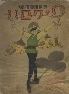 In 1934, Matsumoto drew his first full-fledged manga, a 16-page story titled Nazo no kurōbaa (?(なぞ)のクローバー, "The Mysterious Clover"). Printed as an over-sized pamphlet with a sturdy cardboard cover, and included as a premium in the April issue of Shōjo no tomo, The Mysterious Clover was a variation on The Scarlet Pimpernel and Zorro. The protagonist of The Mysterious Clover is a young girl who protects the poor peasants from the cruel and greedy nobles. This work is remarkable for its use of varying angles, including bird's-eye views, and variation in the size of panels.[3] Sakō Shishido (宍戸左行), influenced by American newspaper strips, had used similar techniques in his 1930 Supiido Tarō (スピード太郎, "Speed Tarō"), but in a far cruder drawing style than Matsumoto's.[16] The Mysterious Clover had been neglected for decades by manga scholars until it was displayed at a 2006 exhibition at the Yayoi Art Museum, where it caught the eye of Fusanosuke Natsume, who then wrote about it on his blog and in a newspaper column.[2]