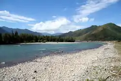 The Katun (Russian: Катунь, Katuń; Altay: Кадын, Kadın) is a river in the Altai Republic and the Altai Krai of Russia. It forms the Ob as it joins the Biya some 19 kilometres (12 mi) southwest of Biysk.[3] The Katun is 688 kilometres (428 mi) long, and its drainage basin covers 60,900 square kilometres (23,500 sq mi).[4] It originates in the Katun glaciers on the southwestern slope of Belukha Mountain. The river freezes up in late November or early December and breaks up in early or mid-April. The main tributaries of the Katun are, from source to mouth: Koksa (left), Kucherla (right), Argut (right), Chuya (right), Ursul (left), Sema (left) and Isha (right). The river is navigable.