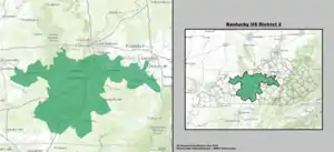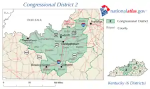 Kentucky's 2nd congressional district is a congressional district in the U.S. state of Kentucky. Located in west central Kentucky, the district includes Bowling Green, Owensboro, Elizabethtown, and a portion of eastern Louisville. The district has not seen an incumbent defeated since 1884.