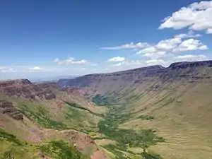 Near the creek's source is Kiger Gorge Overlook, a recreation site managed by the Bureau of Land Management (BLM). The U-shaped gorge, carved through basalt by ice age glaciers, is about a half-mile deep. The overlook is 22 miles (35 km) from the unincorporated community of Frenchglen along Steens Mountain Loop Road. The site is generally open from July 4 through November 1.[6]