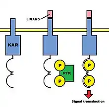 As the chains which form KARs are not able to mediate any signal transduction in isolation, a common feature of such receptors is the presence of noncovalently linked subunits that contain immunoreceptor tyrosine-based activation motifs (ITAMs) in their cytoplasmic tails. ITAMs are composed of a conserved sequence of amino acids, including two Tyr-x-x-Leu/Ile elements (where x is any amino acid) separated by six to eight amino acid residues. When the binding of an activation ligand to an activation receptor complex occurs, the tyrosine residues in the ITAMs in the associated chain are phosphorylated by kinases, and a signal that promotes natural cytotoxicity is conveyed to the interior of the NK cell. Therefore, ITAMs are involved in the facilitation of signal transduction. These subunits are moreover composed of an accessory signaling molecule such as CD3ζ, the γc chain, or one of two adaptor proteins called DAP10 and DAP12. All of these molecules possess negatively charged transmembrane domains.