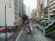 The road is shared between automobile traffic and the Hong Kong Tramways system, and the east bound of the section between eastern Causeway Bay and Quarry Bay bus lane. This tram line runs between Shau Kei Wan to Kennedy Town. Before the opening of Island Eastern Corridor and Island line of the MTR in the 1980s, the road was plagued with traffic congestion. Various measures like creation of bus lanes were taken to address the problem.