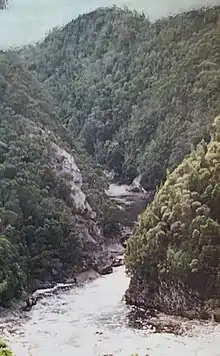 The north bank (except for the Teepookana to Quarter Mile Bridge section which was on the south bank) of the lower portion of the King River valley was the route for the old "Abt" rack railway to Queenstown. In 1962 the original builder and owner, the Mount Lyell Mining and Railway Company closed and removed the line. This has been since restored in early 2002 for tourism purposes. The new line follows exactly the same route and is known as the West Coast Wilderness Railway.[7]