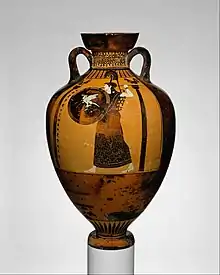 The Kleophrades Panathenaic prize amphora is an Archaic period amphora by the Kleophrades Painter from the collection of the Metropolitan Museum of Art. Dating to c.500 BCE,[1] the amphora, filled with olive oil, was the prize for a victor in the Panathenaia games in Athens. This particular amphora is a neck amphora that stands at 63.5 centimetres (25.0 in) tall.[1]