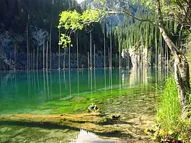 - Lake Kaindy. Located 11 km east of the Kolsay Lakes, Kaindy Lake is located by the Chilik River. The lake is known for its mirror-smooth reflection and stands of dead spruce trunks rising from the water. It was formed in 1911 (when an earthquake caused a landslide that blocked one end of the gorge).[6]